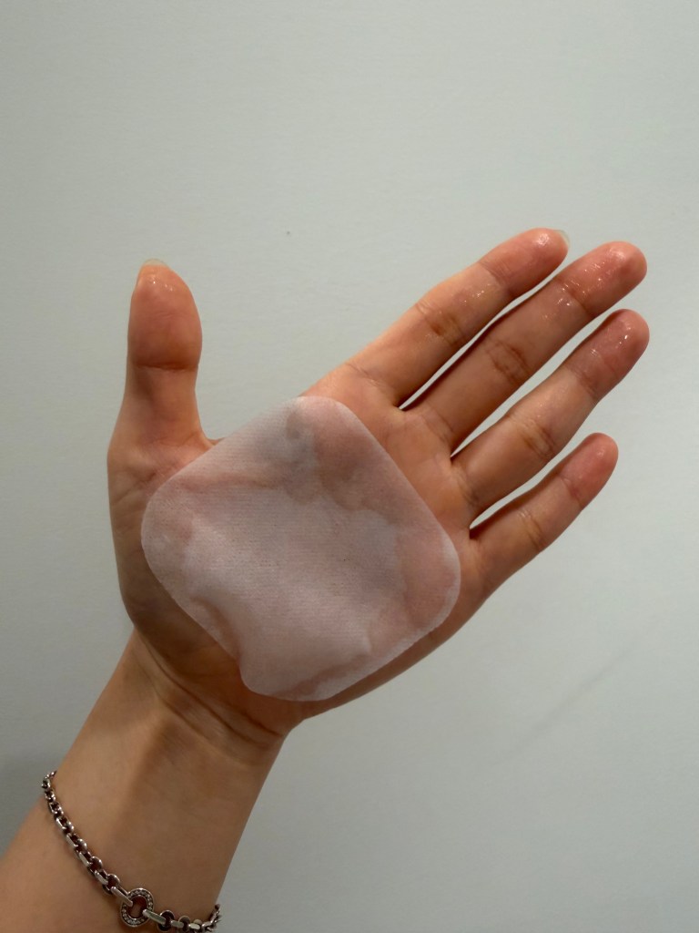 Each pad is big enough to cover each section of the face (Right Cheek, Left Cheek, and Forehead). Here is the picture of the pad on my hand. It is about the size of an average woman’s palm. As you may see in the photo, the pad is very saturated with product.